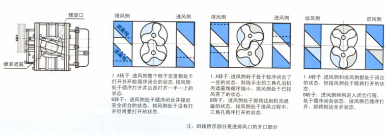 1.螺旋形状是20℃以上的固定螺旋方式。机壳的进排风屏蔽线切入螺旋,以转子顶端光面线构成的三角形进排风口,通过转子的旋转而循序打开。本风机的进排风口,不象旧式罗茨螺旋风机那样在瞬间打开或关闭,所以运转声音极小,几乎没有排风脉动。