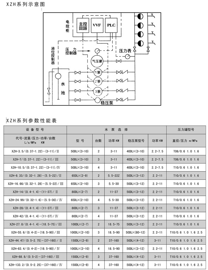 对于带气压罐XZH型给水设备,可实现正常用水量时由消防泵定时轮换、恒压变量供水,夜间小流量时,由气压罐保持管网压力。由于气压罐具有一定的消防贮水量,故更适于消防栓和自动控制喷洒灭火系统。