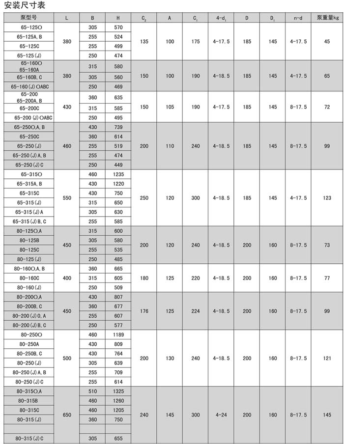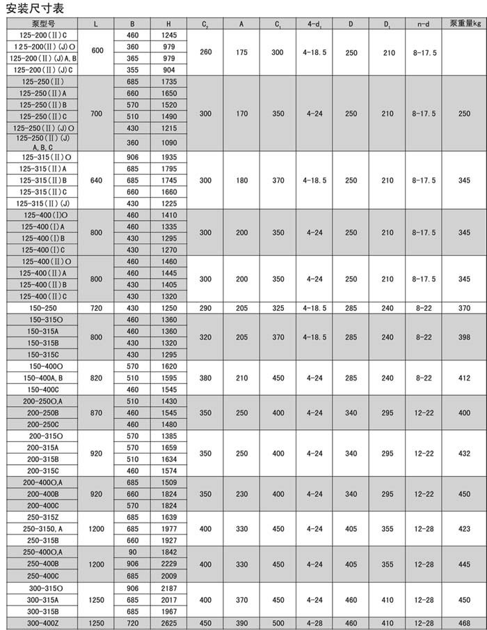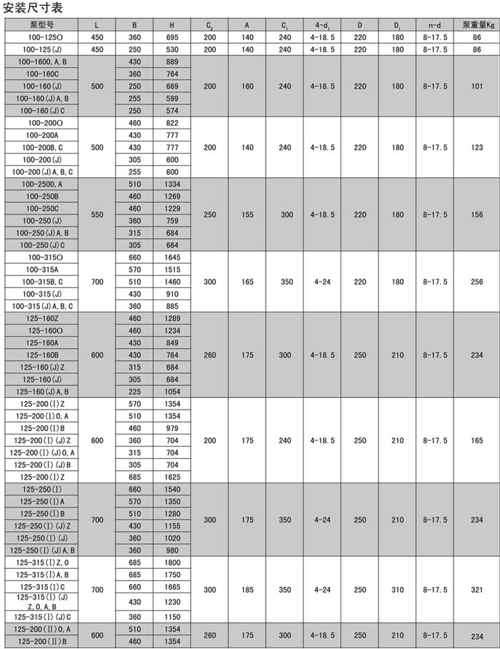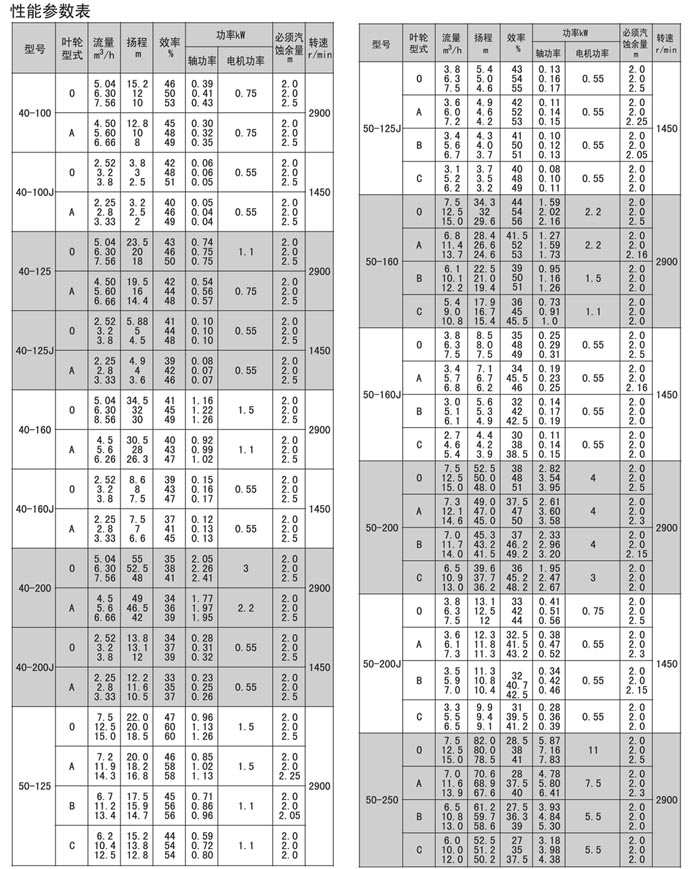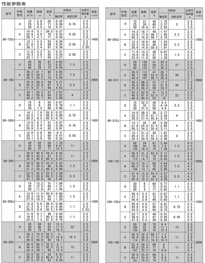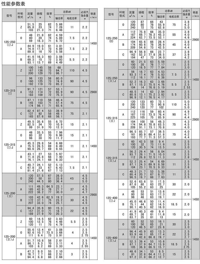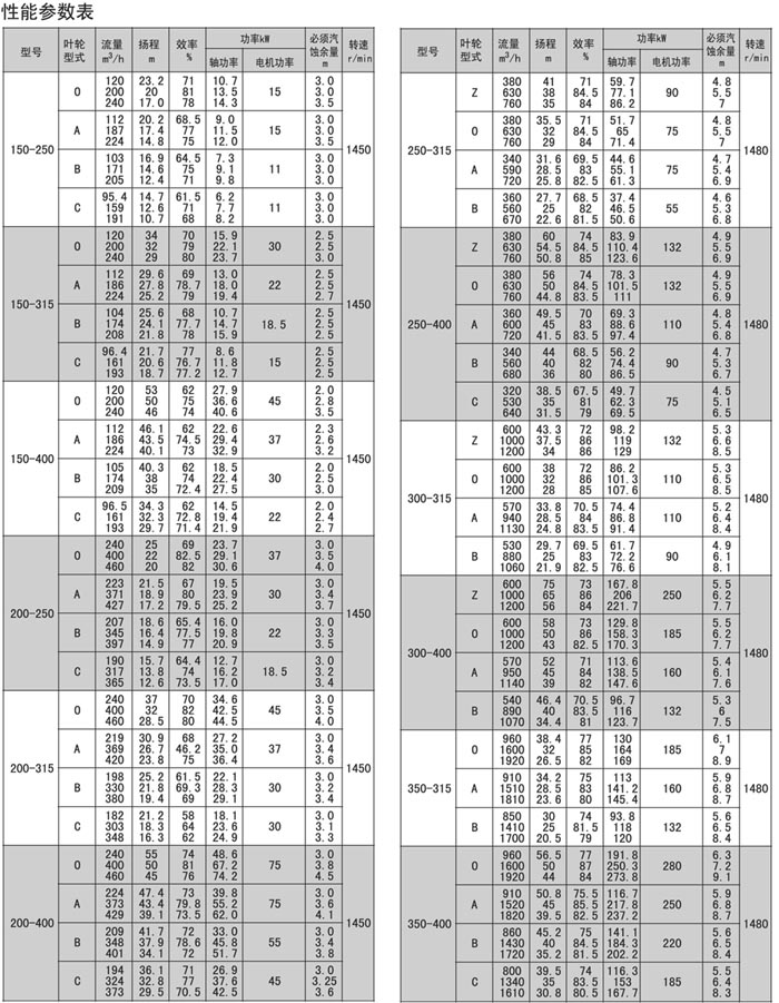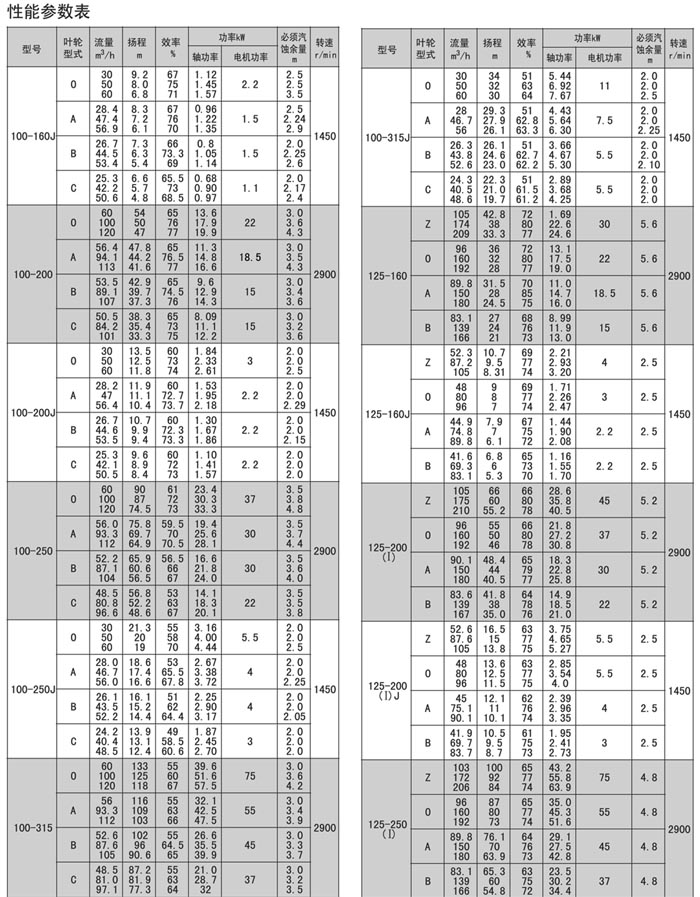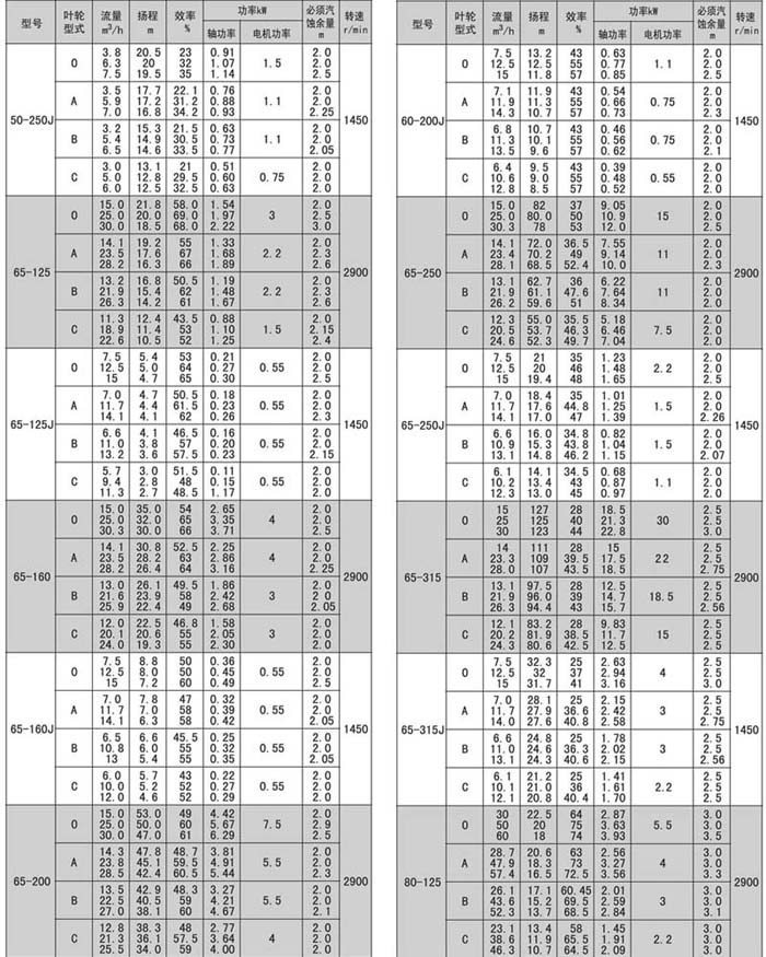 采用ISO2858国际标准,流量范围:1.5—1600m3/h,扬程:8—125m,汽蚀余量2.5—7m,每种型号泵通常分为Z.O.A.B.C五种型式,共有291个规格。